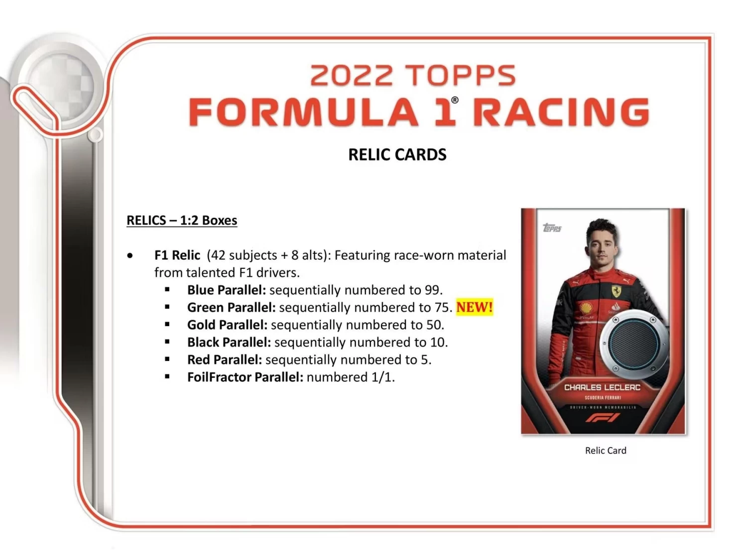 F1 Relic (42 subjects + 8 alts): Featuring race-worn material from talented F1 drivers.