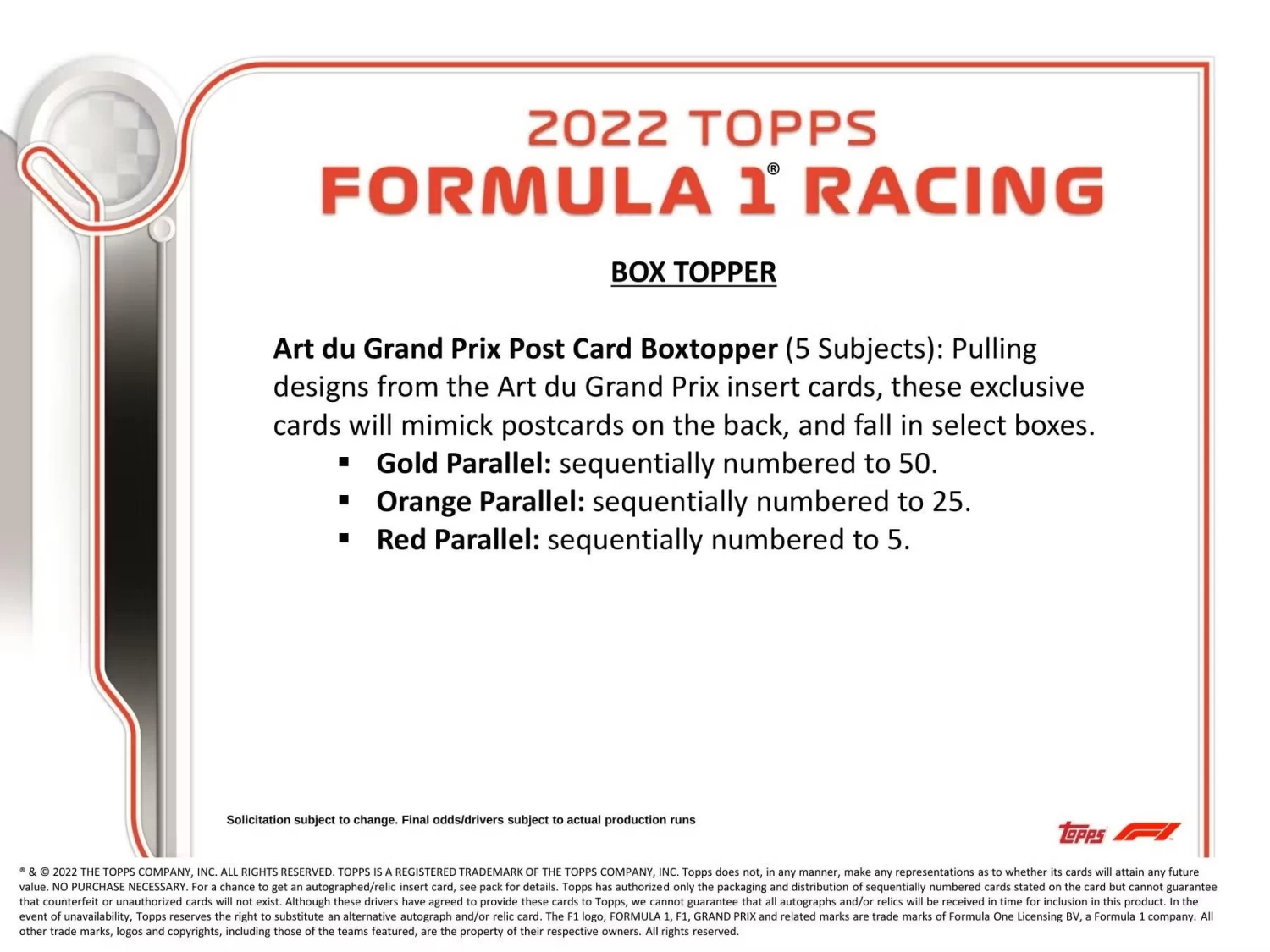 Art du Grand Prix Post Card Boxtopper (5 Subjects): Pulling designs from the Art du Grand Prix insert cards, these exclusive cards will mimick postcards on the back, and fall in select boxes.