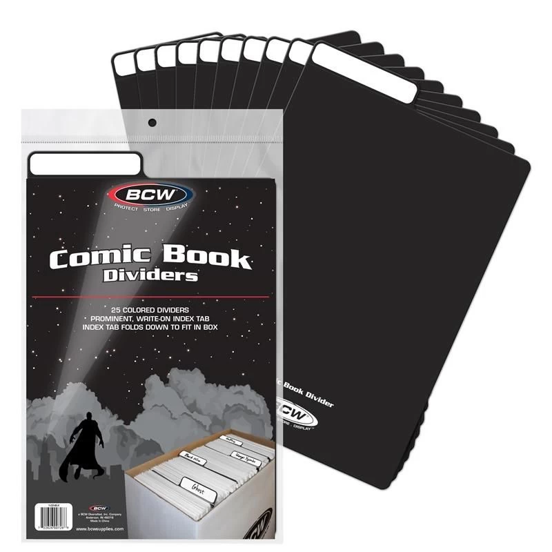 The colored BCW Comic Dividers are made from a full 30-point, high-density Polyethylene Plastic (archival quality), with write-on index tab, and are precision cut to size. These dividers feature a creased tab that can be folded over so that the dividers fit into a box while the lid is on.