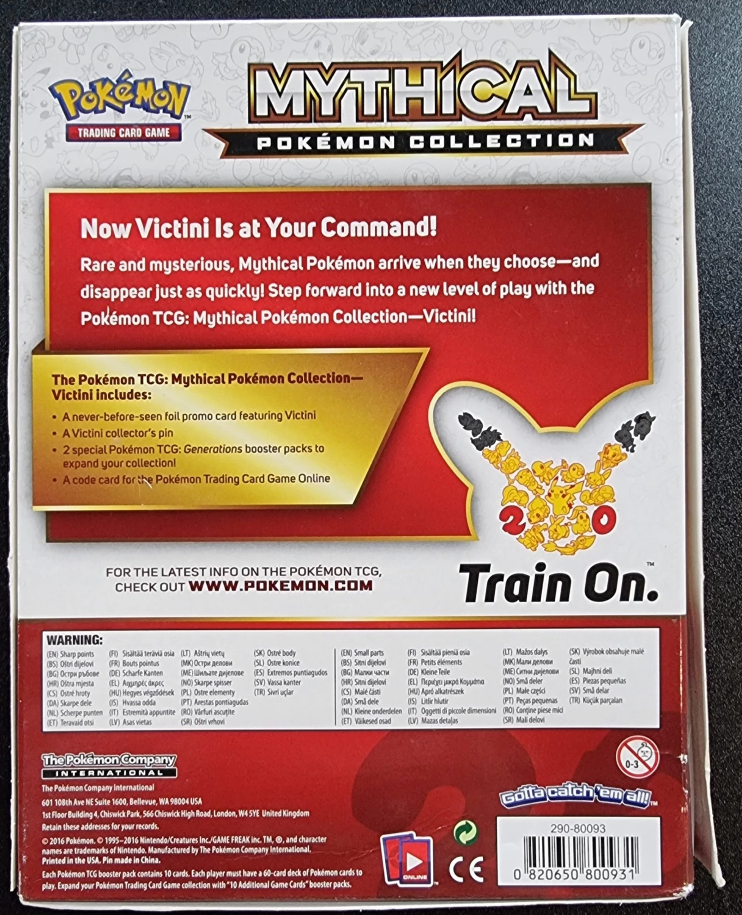 The Mythical Pokémon Victini arrives in the next Pokémon TCG collection celebrating 20 years of Pokémon. The Pokémon TCG: Mythical Pokémon Collection—Victini includes a special Victini promo card and a Victini pin, so you can play and wear the Victory Pokémon. Plus, keep building your collection of Pokémon TCG: Generations cards with two more booster packs.