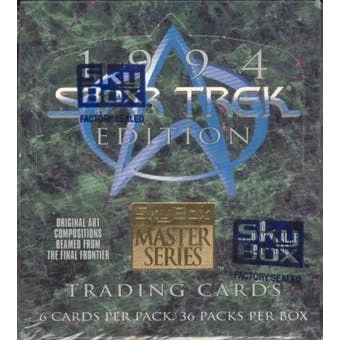 36 packs per box, 6 cards per pack. The painted images by various artists showcased in this set are full-bleed images with story text on the back. The set covers all of the Star Trek shows and movies up to 1994.